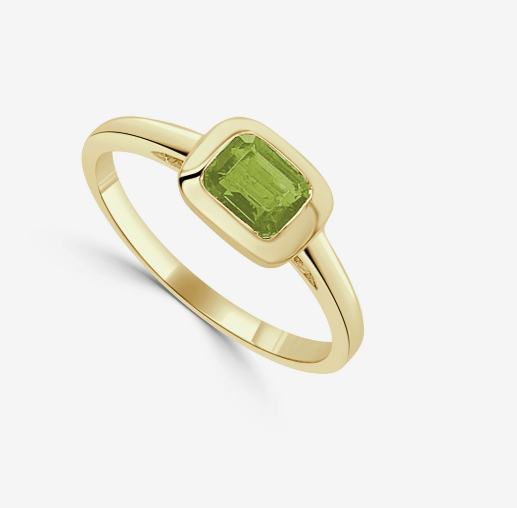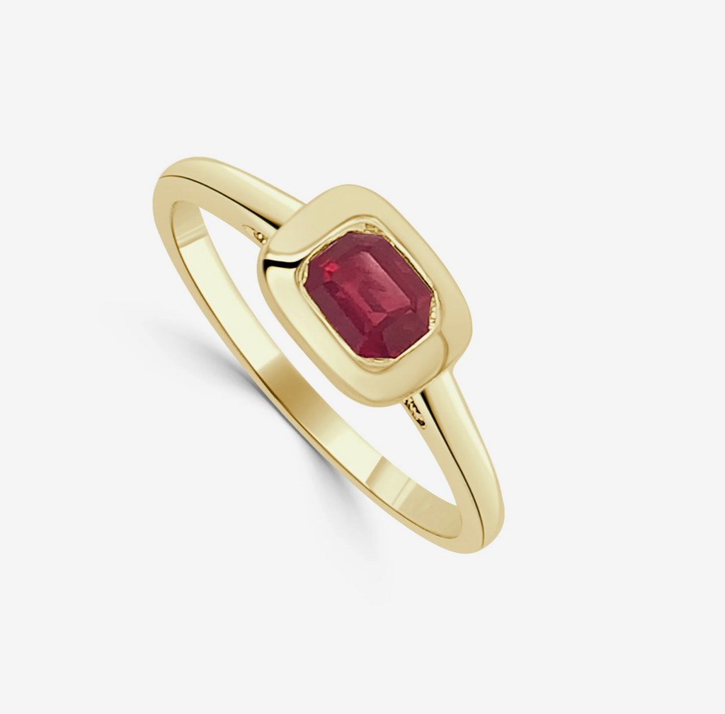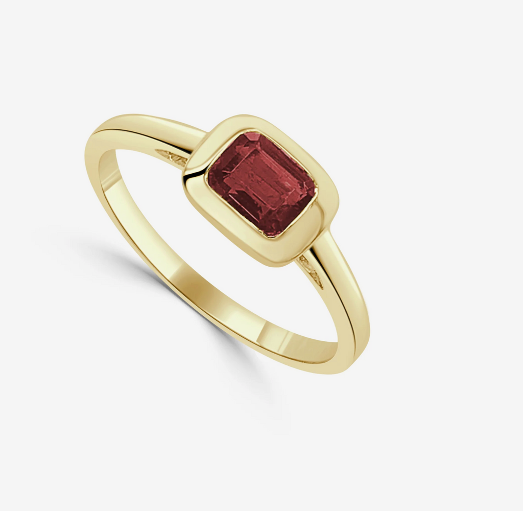 This bezel set birthstone ring features a vibrant .50ct total weight emerald cut gemstone, securely framed in a sleek bezel design for a modern and timeless look. Available in white or yellow gold, this ring can also be made with any birthstone of your choice. It comes in sizes 6–7 but can be sized in-store for the perfect fit. A beautiful piece to wear alone or stacked with other bands.